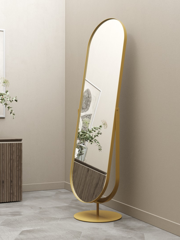Зеркало «Queen». Артикул GMZ-01-1/2/3 Дизайнерское напольное зеркало в полный рост в металлической овальной раме ручной работы выполнено в минималистичном стиле. Простая изысканность форм и современный дизайн делает его уместным практически в любом интерьере. Оно может быть установлено в спальне, прихожей, гостиной, где за счёт своих внушительных размеров способно расширить пространство и создать иллюзию источника освещения. Зеркальное полотно изготовлено известным бельгийским производителем AGC и воплощает в себе старинные европейские традиции в совокупности с новейшими технологиями изготовления стекла. Наклон зеркала оптимальный фиксированный, что позволяет отражать любой рост.Характеристики:– профиль рамы – труба, диаметром 20 мм; – габариты – 1650х540х400 мм; – размер зеркального полотна – 1350х500 мм, толщина – 4 мм; – вес – 11 кг; – устойчивая двухслойная порошковая окраска; – возможные цвета – золотой, чёрный, белый.